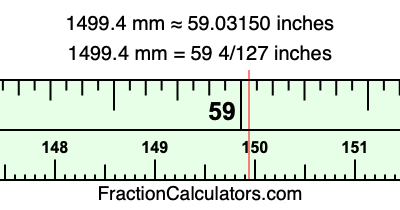 One millimeter is equal to 5/127 inches, and 1499.4 as a fraction is 7497/5. Therefore, to get the fractional answer to 1499.4 mm in inches, we multiply 7497/5 by 5/127 and simplify if necessary.