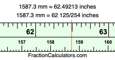 One millimeter is equal to 5/127 inches, and 1587.3 as a fraction is 15873/10. Therefore, to get the fractional answer to 1587.3 mm in inches, we multiply 15873/10 by 5/127 and simplify if necessary.