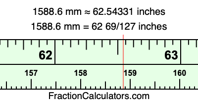 One millimeter is equal to 5/127 inches, and 1588.6 as a fraction is 7943/5. Therefore, to get the fractional answer to 1588.6 mm in inches, we multiply 7943/5 by 5/127 and simplify if necessary.