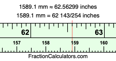 One millimeter is equal to 5/127 inches, and 1589.1 as a fraction is 15891/10. Therefore, to get the fractional answer to 1589.1 mm in inches, we multiply 15891/10 by 5/127 and simplify if necessary.