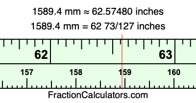 One millimeter is equal to 5/127 inches, and 1589.4 as a fraction is 7947/5. Therefore, to get the fractional answer to 1589.4 mm in inches, we multiply 7947/5 by 5/127 and simplify if necessary.