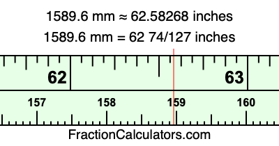 One millimeter is equal to 5/127 inches, and 1589.6 as a fraction is 7948/5. Therefore, to get the fractional answer to 1589.6 mm in inches, we multiply 7948/5 by 5/127 and simplify if necessary.