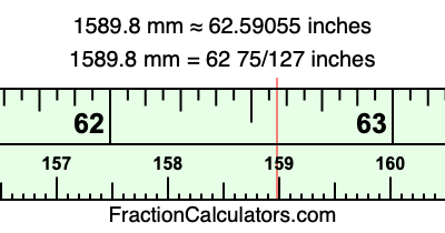 One millimeter is equal to 5/127 inches, and 1589.8 as a fraction is 7949/5. Therefore, to get the fractional answer to 1589.8 mm in inches, we multiply 7949/5 by 5/127 and simplify if necessary.