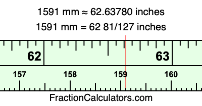 One millimeter is equal to 5/127 inches, and 1591 as a fraction is 1591/1. Therefore, to get the fractional answer to 1591 mm in inches, we multiply 1591/1 by 5/127 and simplify if necessary.