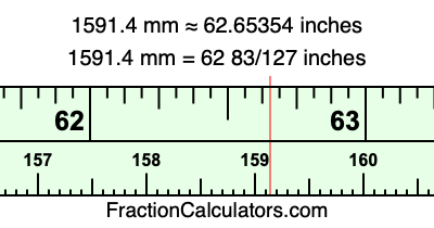 One millimeter is equal to 5/127 inches, and 1591.4 as a fraction is 7957/5. Therefore, to get the fractional answer to 1591.4 mm in inches, we multiply 7957/5 by 5/127 and simplify if necessary.