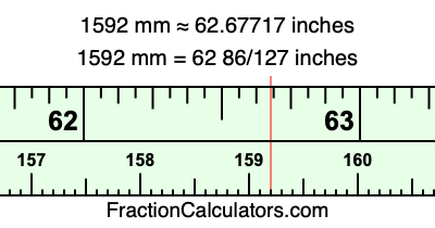 One millimeter is equal to 5/127 inches, and 1592 as a fraction is 1592/1. Therefore, to get the fractional answer to 1592 mm in inches, we multiply 1592/1 by 5/127 and simplify if necessary.