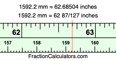 One millimeter is equal to 5/127 inches, and 1592.2 as a fraction is 7961/5. Therefore, to get the fractional answer to 1592.2 mm in inches, we multiply 7961/5 by 5/127 and simplify if necessary.