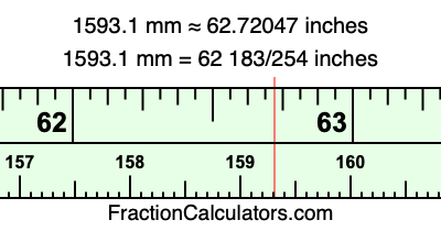 One millimeter is equal to 5/127 inches, and 1593.1 as a fraction is 15931/10. Therefore, to get the fractional answer to 1593.1 mm in inches, we multiply 15931/10 by 5/127 and simplify if necessary.
