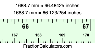 One millimeter is equal to 5/127 inches, and 1688.7 as a fraction is 16887/10. Therefore, to get the fractional answer to 1688.7 mm in inches, we multiply 16887/10 by 5/127 and simplify if necessary.
