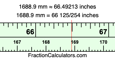 Here is how to convert 1688.9 mm to inches. We will give you the fractional answer, the decimal answer, and illustrate the answer on our tape measure.