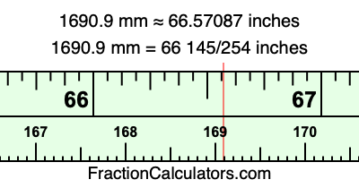 One millimeter is equal to 5/127 inches, and 1690.9 as a fraction is 16909/10. Therefore, to get the fractional answer to 1690.9 mm in inches, we multiply 16909/10 by 5/127 and simplify if necessary.