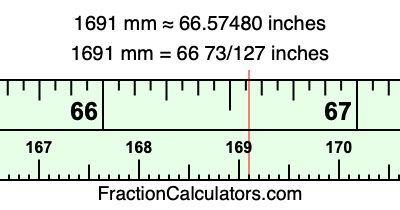 One millimeter is equal to 5/127 inches, and 1691 as a fraction is 1691/1. Therefore, to get the fractional answer to 1691 mm in inches, we multiply 1691/1 by 5/127 and simplify if necessary.