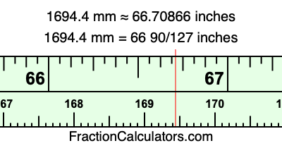 One millimeter is equal to 5/127 inches, and 1694.4 as a fraction is 8472/5. Therefore, to get the fractional answer to 1694.4 mm in inches, we multiply 8472/5 by 5/127 and simplify if necessary.