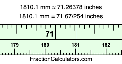 One millimeter is equal to 5/127 inches, and 1810.1 as a fraction is 18101/10. Therefore, to get the fractional answer to 1810.1 mm in inches, we multiply 18101/10 by 5/127 and simplify if necessary.