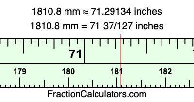 One millimeter is equal to 5/127 inches, and 1810.8 as a fraction is 9054/5. Therefore, to get the fractional answer to 1810.8 mm in inches, we multiply 9054/5 by 5/127 and simplify if necessary.