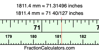 One millimeter is equal to 5/127 inches, and 1811.4 as a fraction is 9057/5. Therefore, to get the fractional answer to 1811.4 mm in inches, we multiply 9057/5 by 5/127 and simplify if necessary.