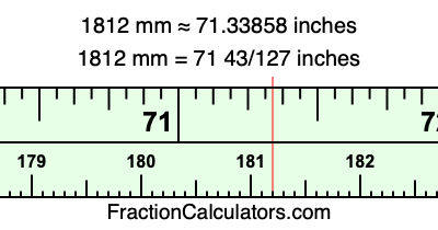 One millimeter is equal to 5/127 inches, and 1812 as a fraction is 1812/1. Therefore, to get the fractional answer to 1812 mm in inches, we multiply 1812/1 by 5/127 and simplify if necessary.