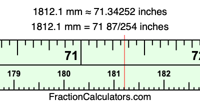 One millimeter is equal to 5/127 inches, and 1812.1 as a fraction is 18121/10. Therefore, to get the fractional answer to 1812.1 mm in inches, we multiply 18121/10 by 5/127 and simplify if necessary.