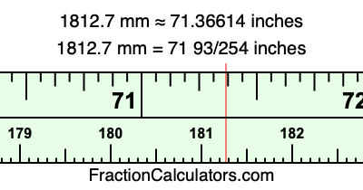 One millimeter is equal to 5/127 inches, and 1812.7 as a fraction is 18127/10. Therefore, to get the fractional answer to 1812.7 mm in inches, we multiply 18127/10 by 5/127 and simplify if necessary.