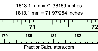 One millimeter is equal to 5/127 inches, and 1813.1 as a fraction is 18131/10. Therefore, to get the fractional answer to 1813.1 mm in inches, we multiply 18131/10 by 5/127 and simplify if necessary.