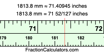 One millimeter is equal to 5/127 inches, and 1813.8 as a fraction is 9069/5. Therefore, to get the fractional answer to 1813.8 mm in inches, we multiply 9069/5 by 5/127 and simplify if necessary.