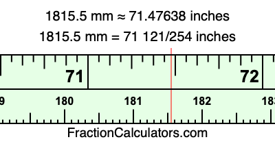 One millimeter is equal to 5/127 inches, and 1815.5 as a fraction is 3631/2. Therefore, to get the fractional answer to 1815.5 mm in inches, we multiply 3631/2 by 5/127 and simplify if necessary.