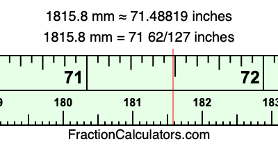 One millimeter is equal to 5/127 inches, and 1815.8 as a fraction is 9079/5. Therefore, to get the fractional answer to 1815.8 mm in inches, we multiply 9079/5 by 5/127 and simplify if necessary.