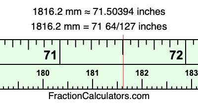 One millimeter is equal to 5/127 inches, and 1816.2 as a fraction is 9081/5. Therefore, to get the fractional answer to 1816.2 mm in inches, we multiply 9081/5 by 5/127 and simplify if necessary.