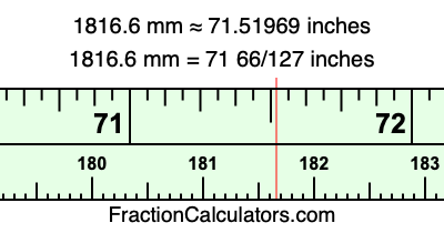 One millimeter is equal to 5/127 inches, and 1816.6 as a fraction is 9083/5. Therefore, to get the fractional answer to 1816.6 mm in inches, we multiply 9083/5 by 5/127 and simplify if necessary.