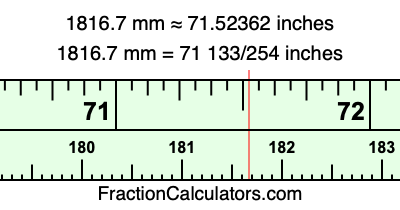One millimeter is equal to 5/127 inches, and 1816.7 as a fraction is 18167/10. Therefore, to get the fractional answer to 1816.7 mm in inches, we multiply 18167/10 by 5/127 and simplify if necessary.