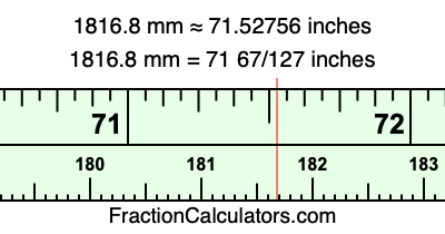 One millimeter is equal to 5/127 inches, and 1816.8 as a fraction is 9084/5. Therefore, to get the fractional answer to 1816.8 mm in inches, we multiply 9084/5 by 5/127 and simplify if necessary.