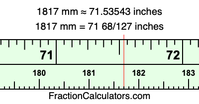 One millimeter is equal to 5/127 inches, and 1817 as a fraction is 1817/1. Therefore, to get the fractional answer to 1817 mm in inches, we multiply 1817/1 by 5/127 and simplify if necessary.
