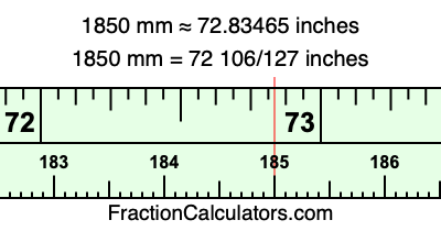 One millimeter is equal to 5/127 inches, and 1850 as a fraction is 1850/1. Therefore, to get the fractional answer to 1850 mm in inches, we multiply 1850/1 by 5/127 and simplify if necessary.