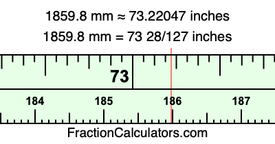 One millimeter is equal to 5/127 inches, and 1859.8 as a fraction is 9299/5. Therefore, to get the fractional answer to 1859.8 mm in inches, we multiply 9299/5 by 5/127 and simplify if necessary.