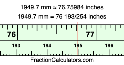 One millimeter is equal to 5/127 inches, and 1949.7 as a fraction is 19497/10. Therefore, to get the fractional answer to 1949.7 mm in inches, we multiply 19497/10 by 5/127 and simplify if necessary.