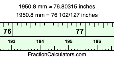 One millimeter is equal to 5/127 inches, and 1950.8 as a fraction is 9754/5. Therefore, to get the fractional answer to 1950.8 mm in inches, we multiply 9754/5 by 5/127 and simplify if necessary.