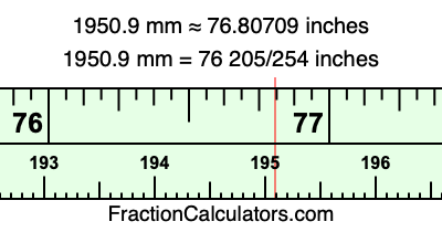 One millimeter is equal to 5/127 inches, and 1950.9 as a fraction is 19509/10. Therefore, to get the fractional answer to 1950.9 mm in inches, we multiply 19509/10 by 5/127 and simplify if necessary.