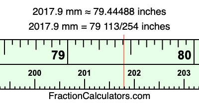 One millimeter is equal to 5/127 inches, and 2017.9 as a fraction is 20179/10. Therefore, to get the fractional answer to 2017.9 mm in inches, we multiply 20179/10 by 5/127 and simplify if necessary.