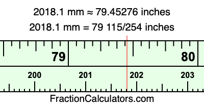 One millimeter is equal to 5/127 inches, and 2018.1 as a fraction is 20181/10. Therefore, to get the fractional answer to 2018.1 mm in inches, we multiply 20181/10 by 5/127 and simplify if necessary.