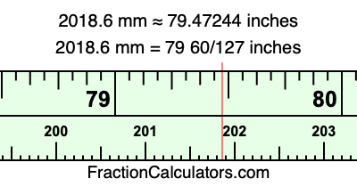 One millimeter is equal to 5/127 inches, and 2018.6 as a fraction is 10093/5. Therefore, to get the fractional answer to 2018.6 mm in inches, we multiply 10093/5 by 5/127 and simplify if necessary.