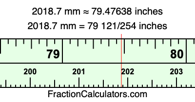 One millimeter is equal to 5/127 inches, and 2018.7 as a fraction is 20187/10. Therefore, to get the fractional answer to 2018.7 mm in inches, we multiply 20187/10 by 5/127 and simplify if necessary.