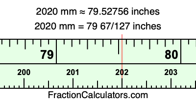 One millimeter is equal to 5/127 inches, and 2020 as a fraction is 2020/1. Therefore, to get the fractional answer to 2020 mm in inches, we multiply 2020/1 by 5/127 and simplify if necessary.