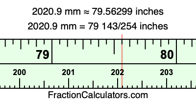 One millimeter is equal to 5/127 inches, and 2020.9 as a fraction is 20209/10. Therefore, to get the fractional answer to 2020.9 mm in inches, we multiply 20209/10 by 5/127 and simplify if necessary.