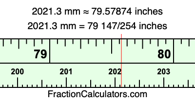 One millimeter is equal to 5/127 inches, and 2021.3 as a fraction is 20213/10. Therefore, to get the fractional answer to 2021.3 mm in inches, we multiply 20213/10 by 5/127 and simplify if necessary.