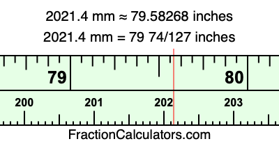 One millimeter is equal to 5/127 inches, and 2021.4 as a fraction is 10107/5. Therefore, to get the fractional answer to 2021.4 mm in inches, we multiply 10107/5 by 5/127 and simplify if necessary.