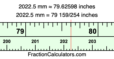 One millimeter is equal to 5/127 inches, and 2022.5 as a fraction is 4045/2. Therefore, to get the fractional answer to 2022.5 mm in inches, we multiply 4045/2 by 5/127 and simplify if necessary.