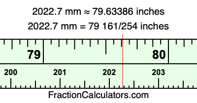One millimeter is equal to 5/127 inches, and 2022.7 as a fraction is 20227/10. Therefore, to get the fractional answer to 2022.7 mm in inches, we multiply 20227/10 by 5/127 and simplify if necessary.