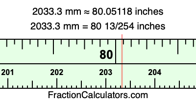 One millimeter is equal to 5/127 inches, and 2033.3 as a fraction is 20333/10. Therefore, to get the fractional answer to 2033.3 mm in inches, we multiply 20333/10 by 5/127 and simplify if necessary.