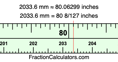 One millimeter is equal to 5/127 inches, and 2033.6 as a fraction is 10168/5. Therefore, to get the fractional answer to 2033.6 mm in inches, we multiply 10168/5 by 5/127 and simplify if necessary.