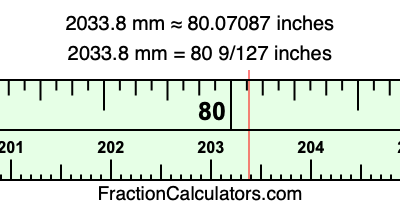 One millimeter is equal to 5/127 inches, and 2033.8 as a fraction is 10169/5. Therefore, to get the fractional answer to 2033.8 mm in inches, we multiply 10169/5 by 5/127 and simplify if necessary.